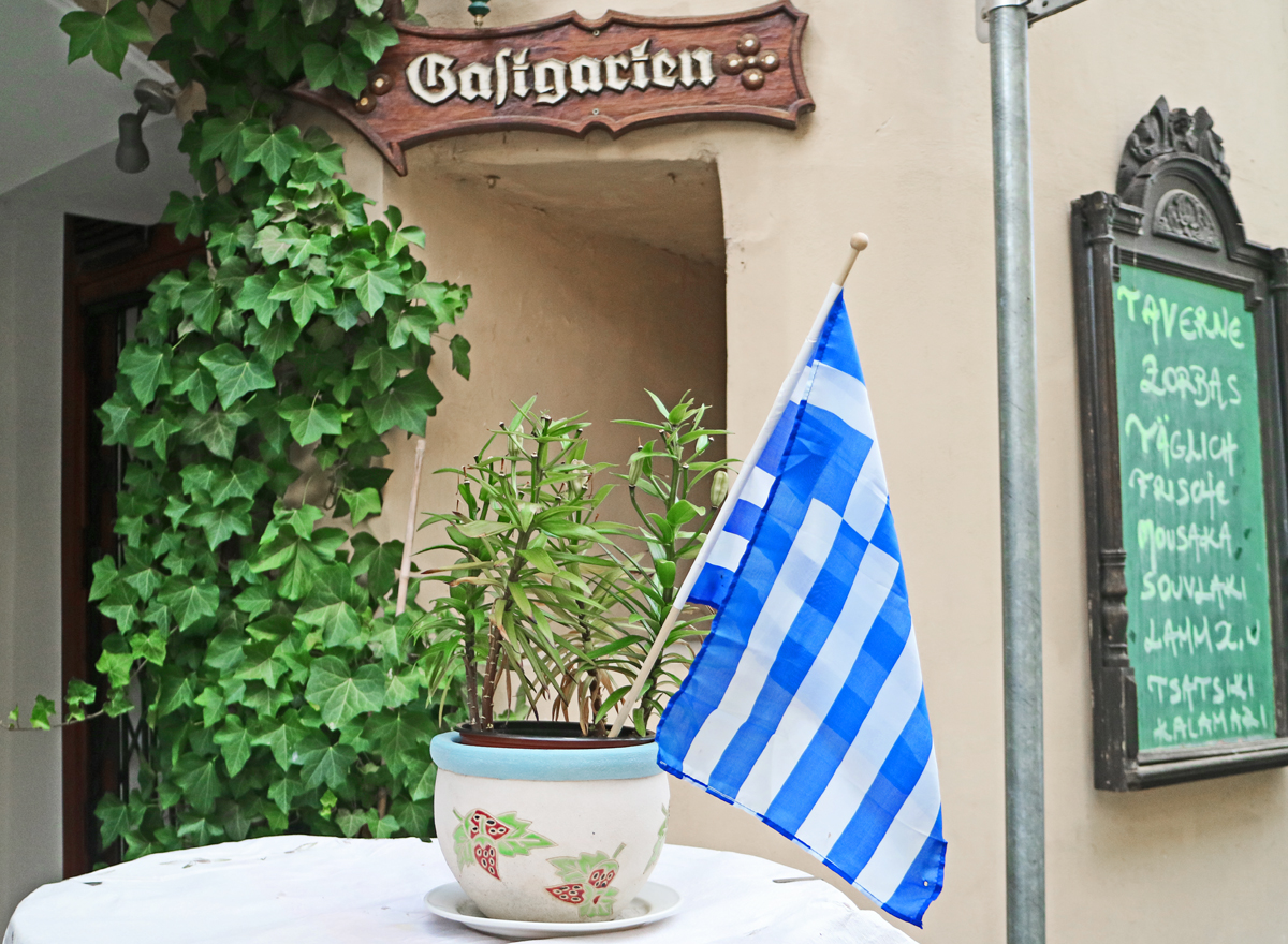Wen also die Sehnsucht nach Süden noch in der Umarmung hat, dem empfehle ich die Taverne Zorbas. Ich hab einen lauen Abend erwischt, um das Lokal in der Steiner Landstraße zu testen. Der Hof bis auf den letzten Platz gefüllt. Zusatzsessel wurden angekarrt. Wir saßen in der – sehr bunten – Gaststube. Früher ein Wirtshaus. Eiche Rustikal an schillerndem Fischernetz. Und es war herrlich!