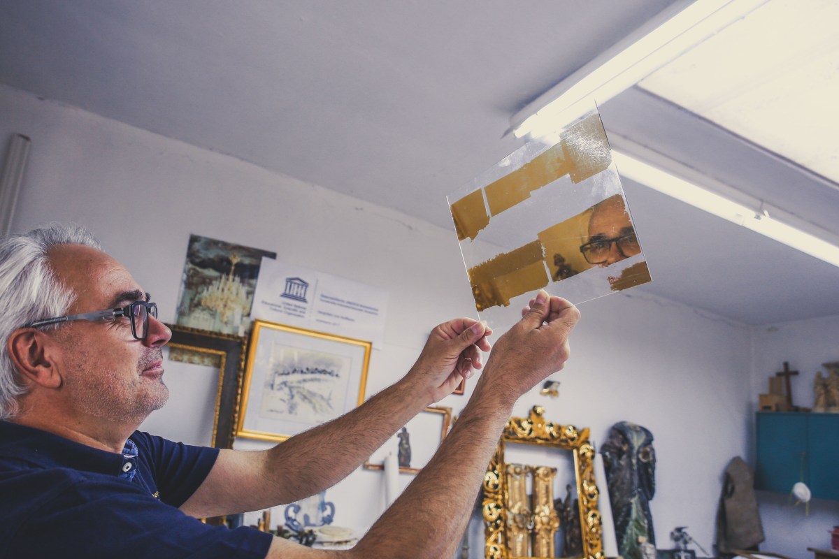Und wenn nach vielen Arbeitsschritten der Kerzenständer am Ende in Gold glänzt, ist von seinem Holz-Kern nichts mehr zu erahnen. „Wir Vergolder erzielen mit wenig Material große Effekte. Blattgold ist ja nur ein Fünf- bis Zehntausendstel Millimeter dünn, also in Summe ist da kaum Gold drauf. Es wirkt aber wie wenn das Objekt aus purem Gold wäre.“