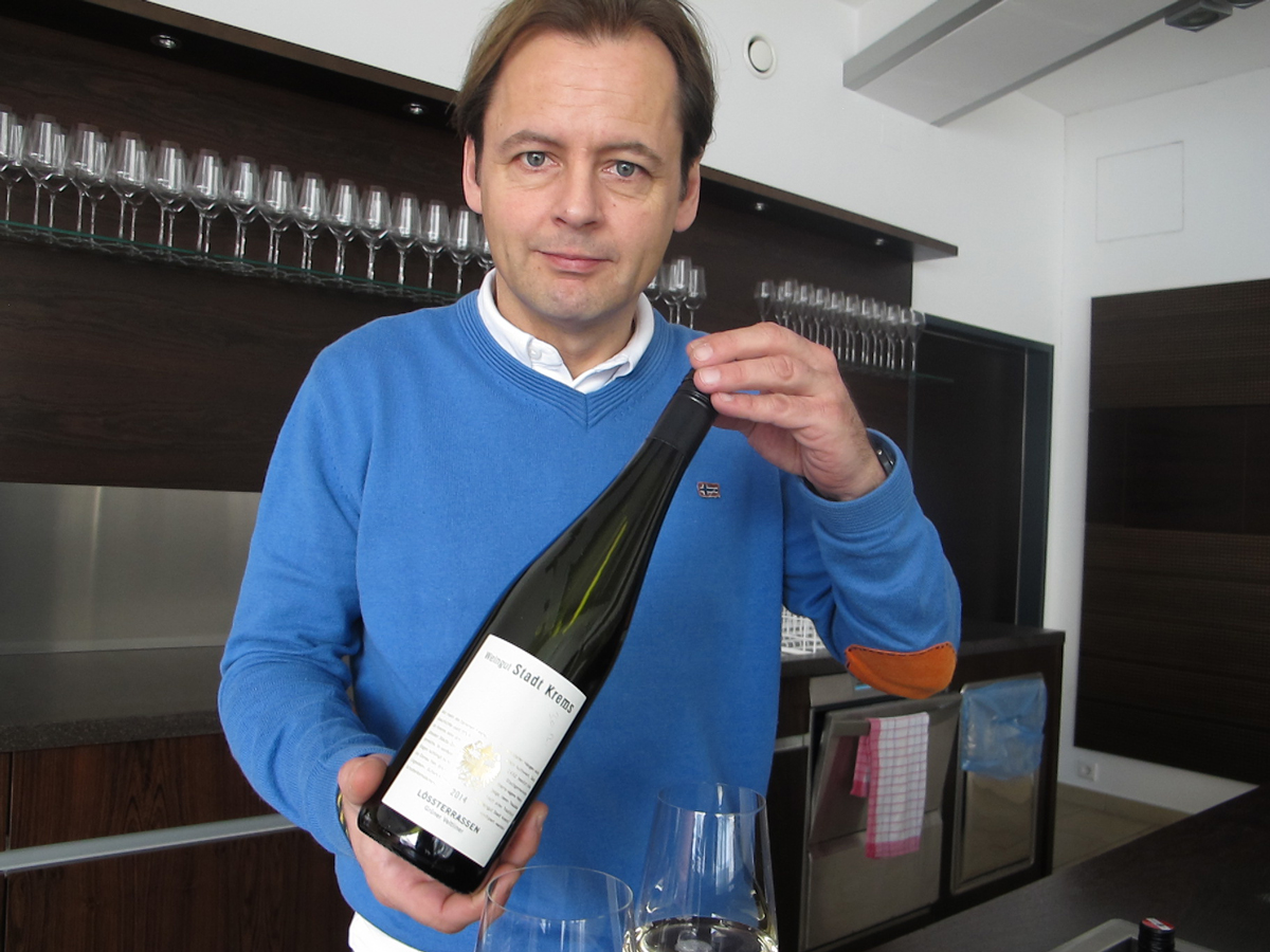 „Die Lössterrasse“ ist in Krems schon ein Begriff. Ein toller „Zwitscherwein“, wie ihn Geschäftsführer Fritz Miesbauer beschreibt. Ein grüner Veltliner, typisch für Krems: Prickelnd. Würzig. Frisch. Um € 6,50 ab Hof. Sehr ok.